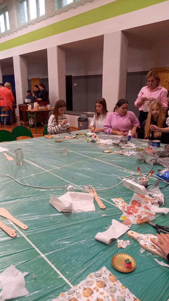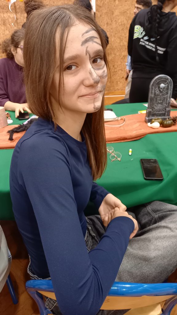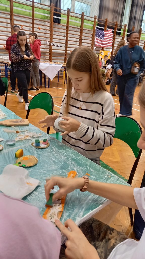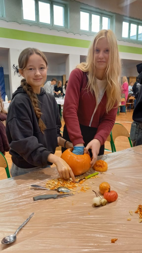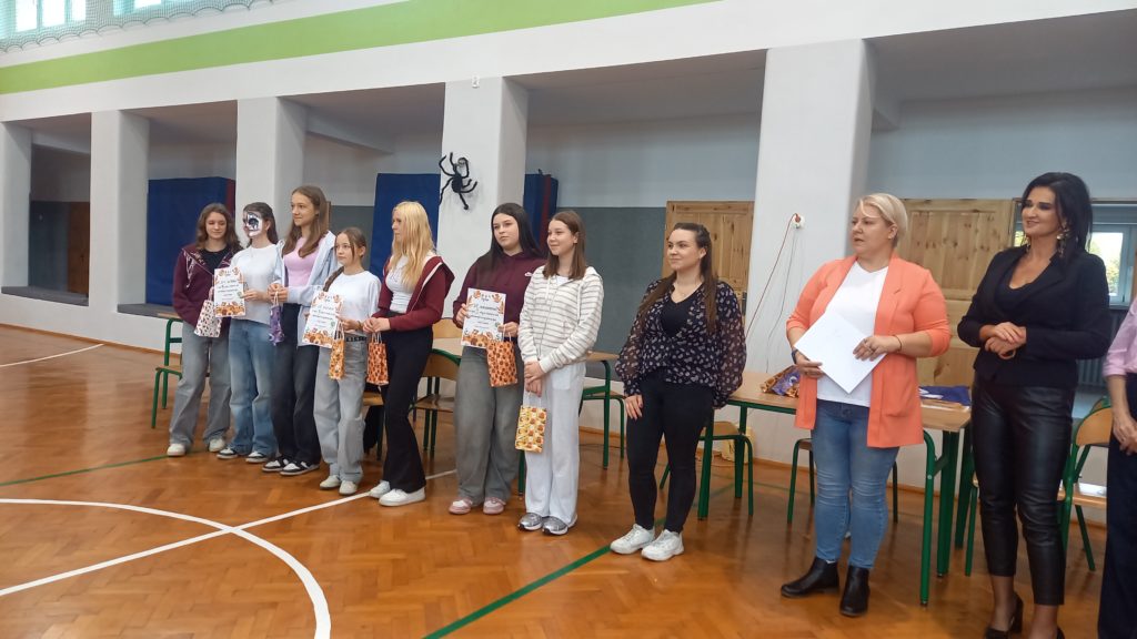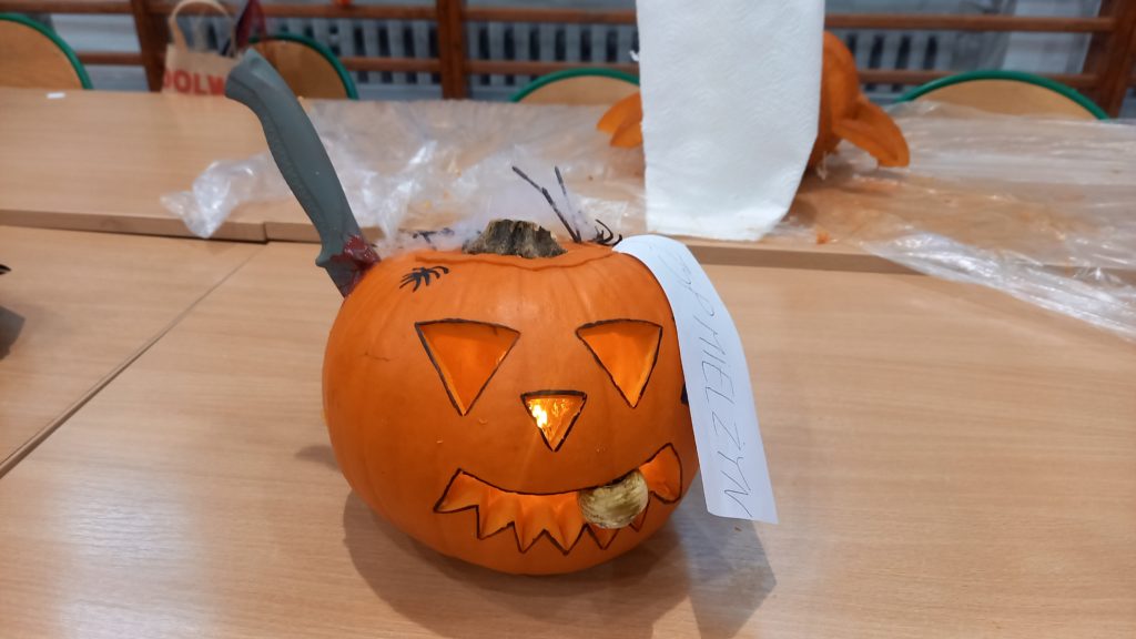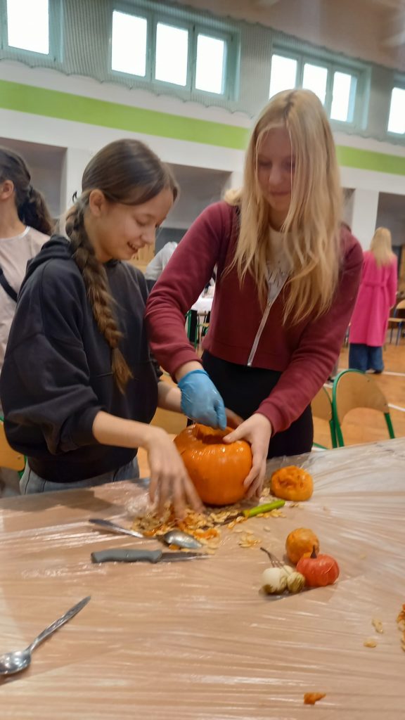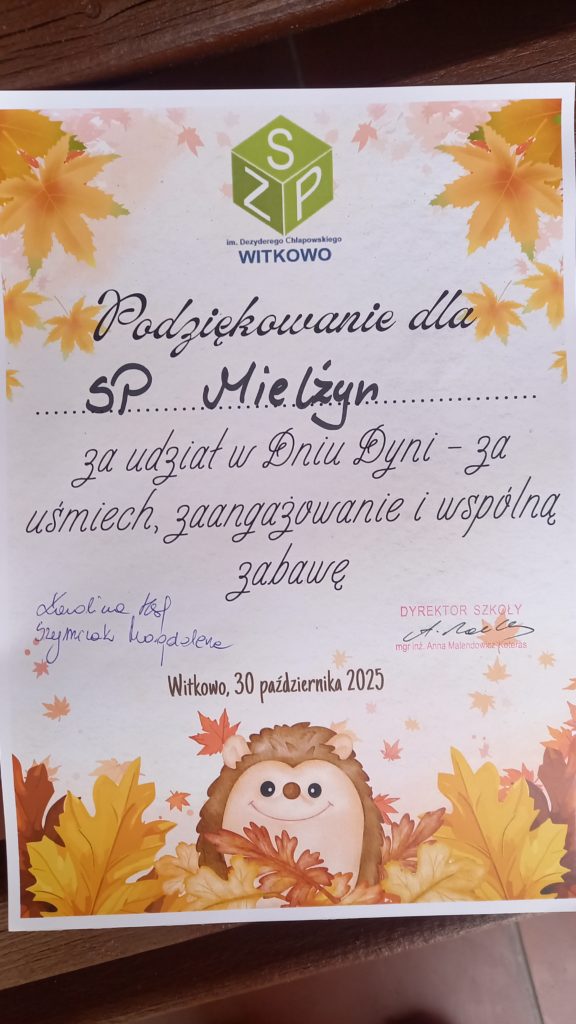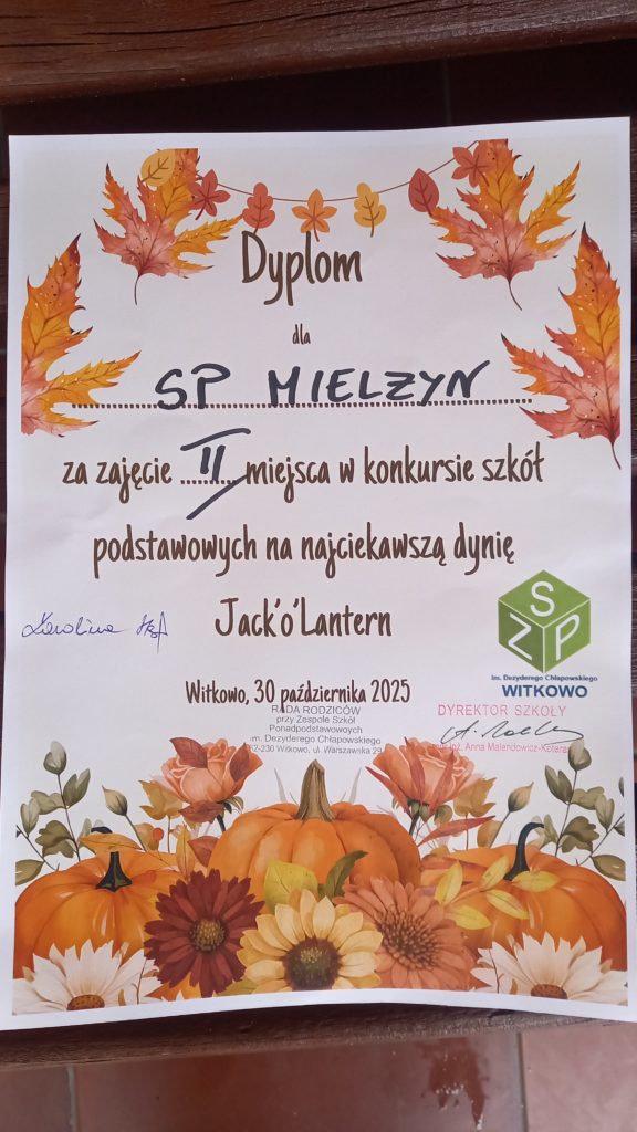 Dnia 30 października 2025r. sześcioro uczniów z klas 7-8 brało udział w Dniu Dyni i Meksykańskim Święcie Zmarłych w ZSP w Witkowie. W ramach tego dnia odbyły się różnorodne warsztaty (rekodzielnicze, kulinarne,malowania twarzy) oraz konkurs Jack O’Lantern. Na zakończenie uczniowie wspólnie z amerykańskimi żołnierzami zatańczyli do kilku popularnych polskich i amerykańskich utworów. Uczennice Kornelia Jaskólska i Weronika Mikołajczak zajęły II MIEJSCE w konkursie Jack’o’Lantern.