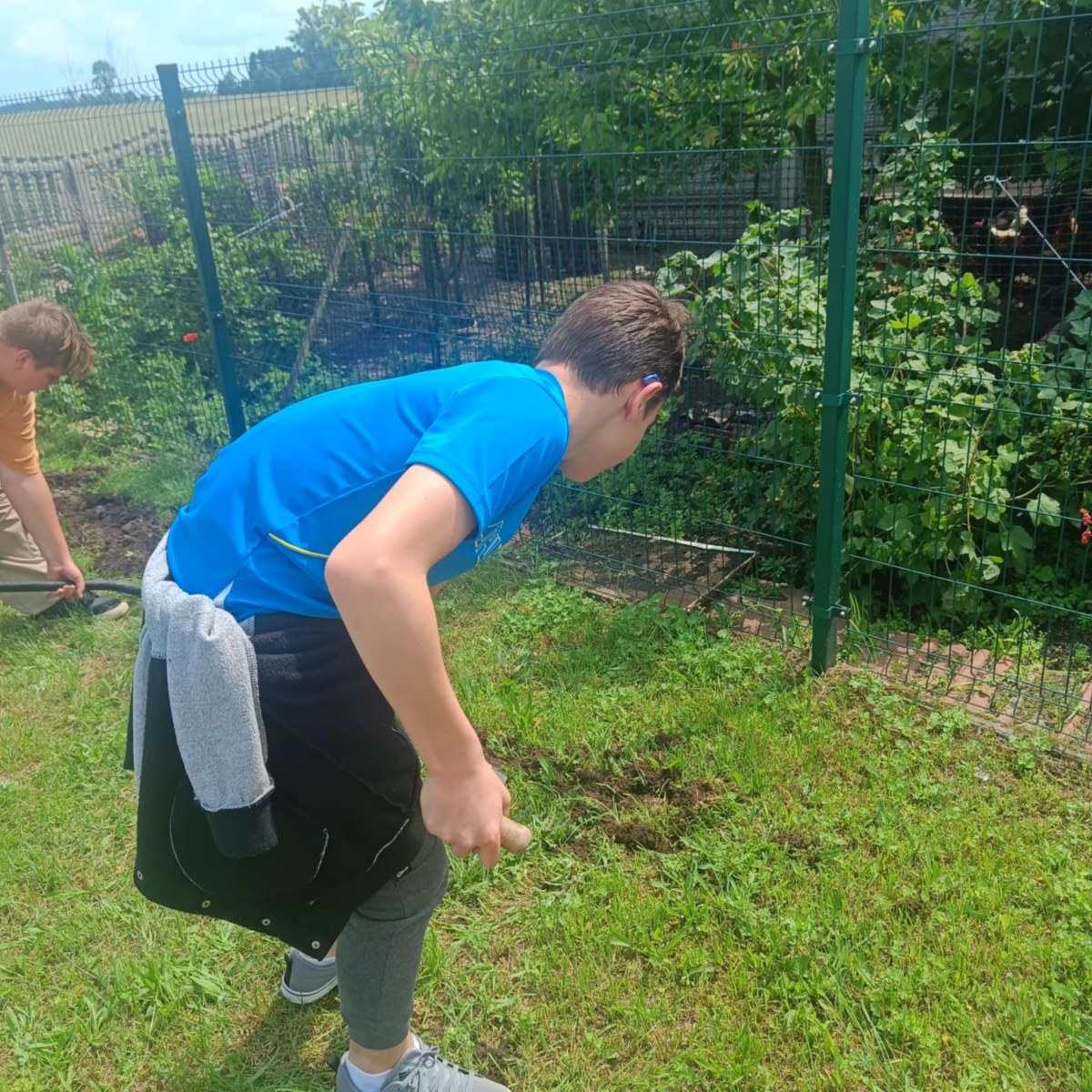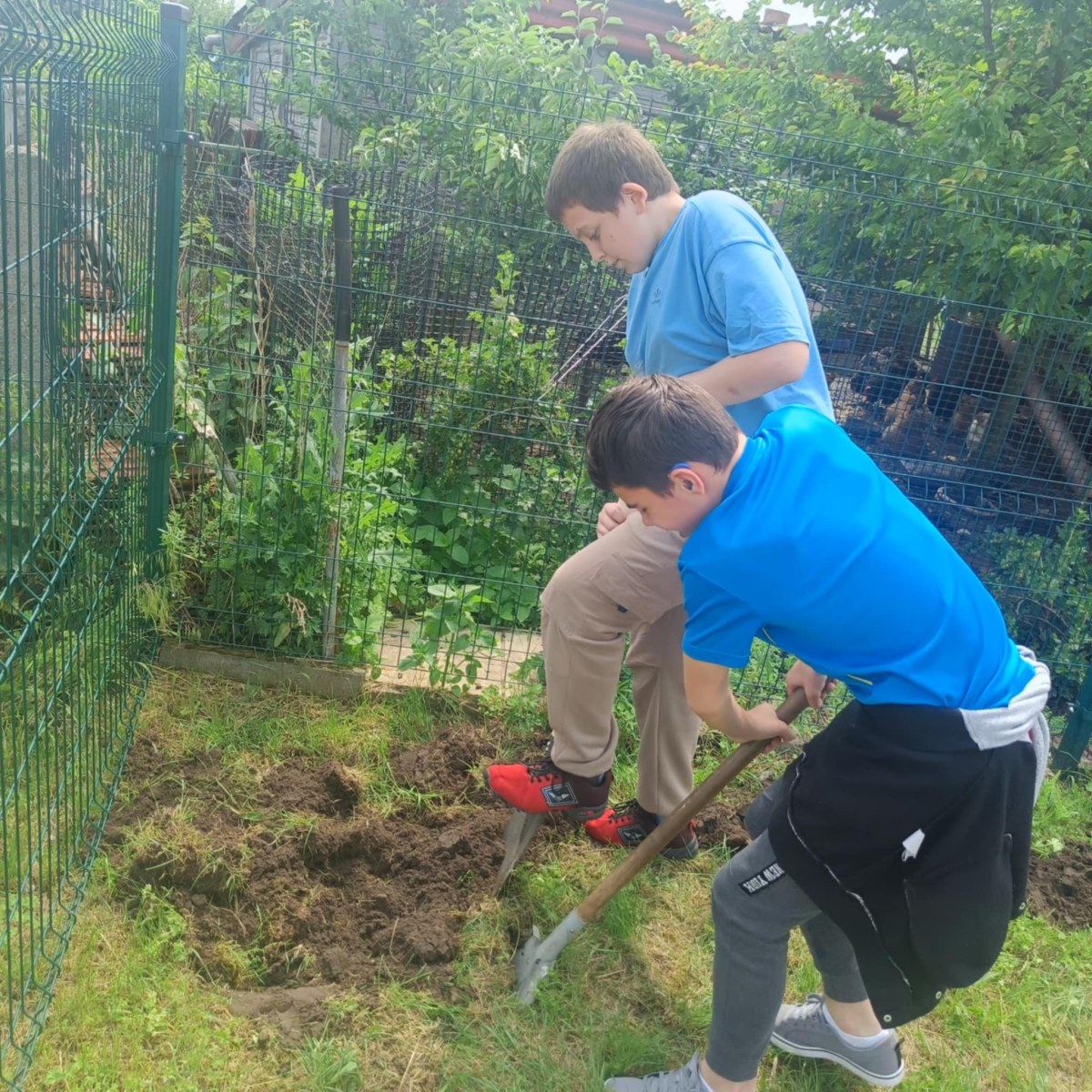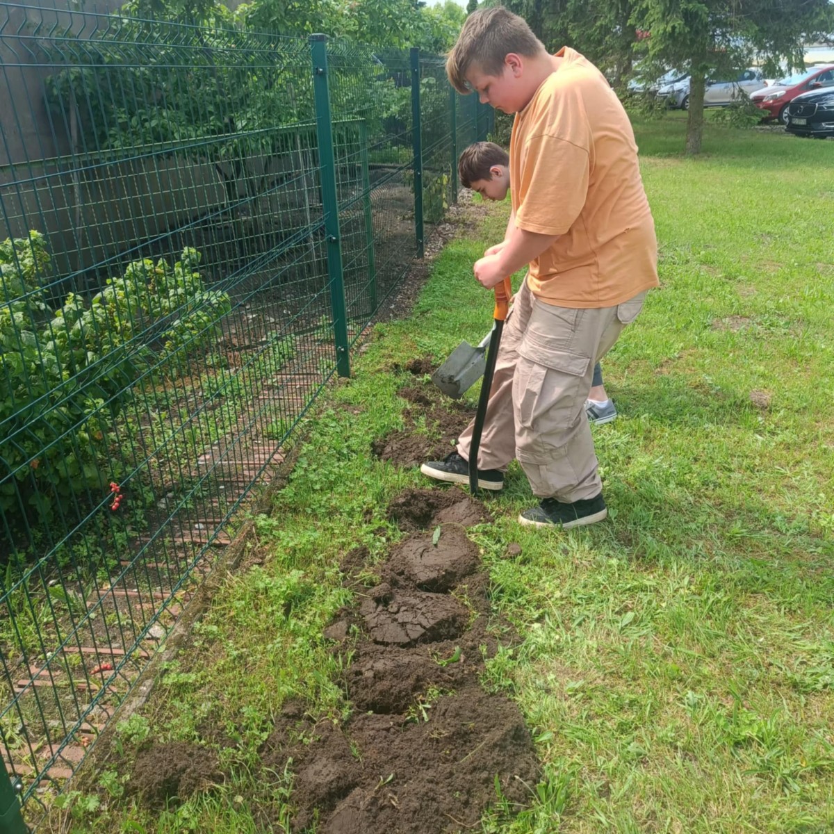Uczniowie sieją łąkę kwietną przy szkole i świetlicy wiejskiej w Mielżynie.