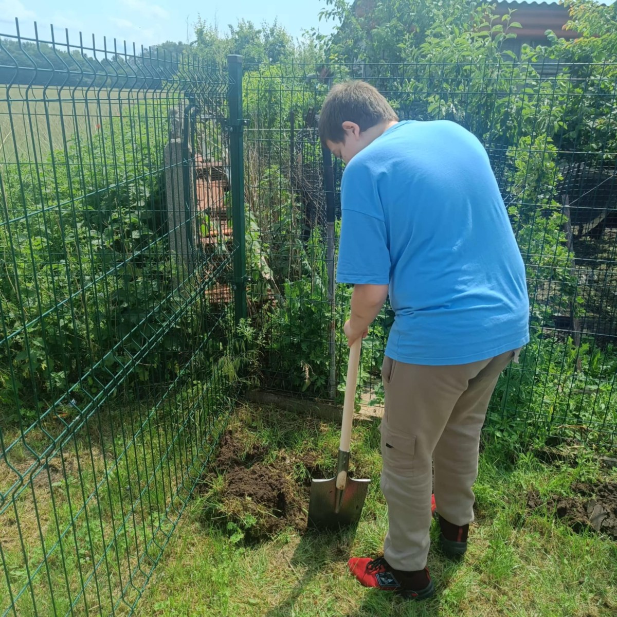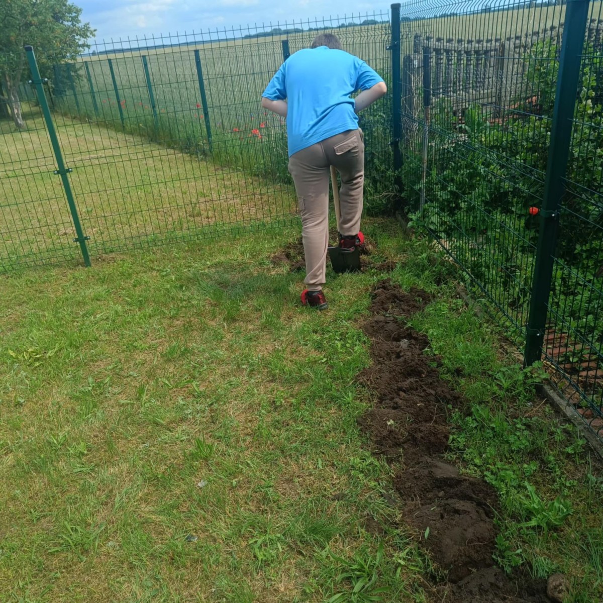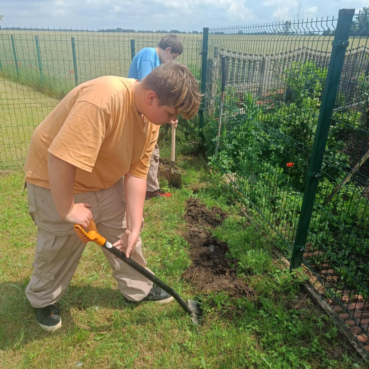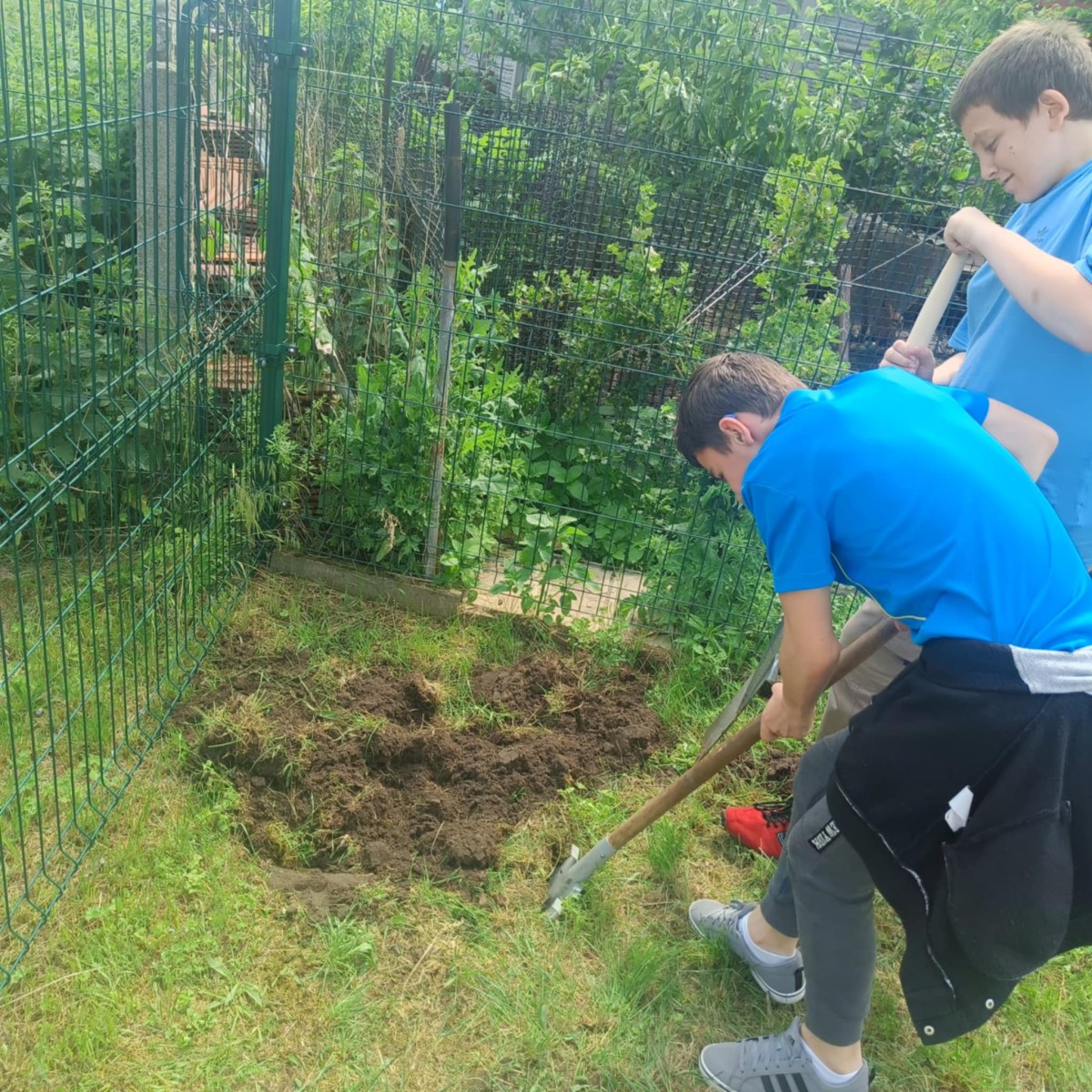 Uczniowie sieją łąkę kwietną przy szkole i świetlicy wiejskiej w Mielżynie.