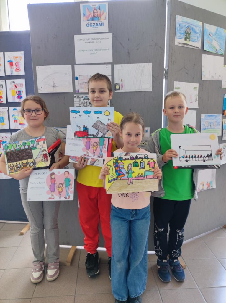 W minionym tygodniu został rozstrzygnięty szkolny etap ogólnopolskiego konkursu plastycznego ph: „Miejsce pracy rodzica oczami ucznia”. Do finału zakwalifikował się Patryk Malawko z klasy 2, Zuzanna Tyczka, Krystyna Łysiak i Daniel Kowalik z klasy 3. Czekamy na dalsze wyniki .
