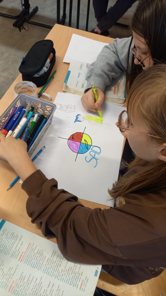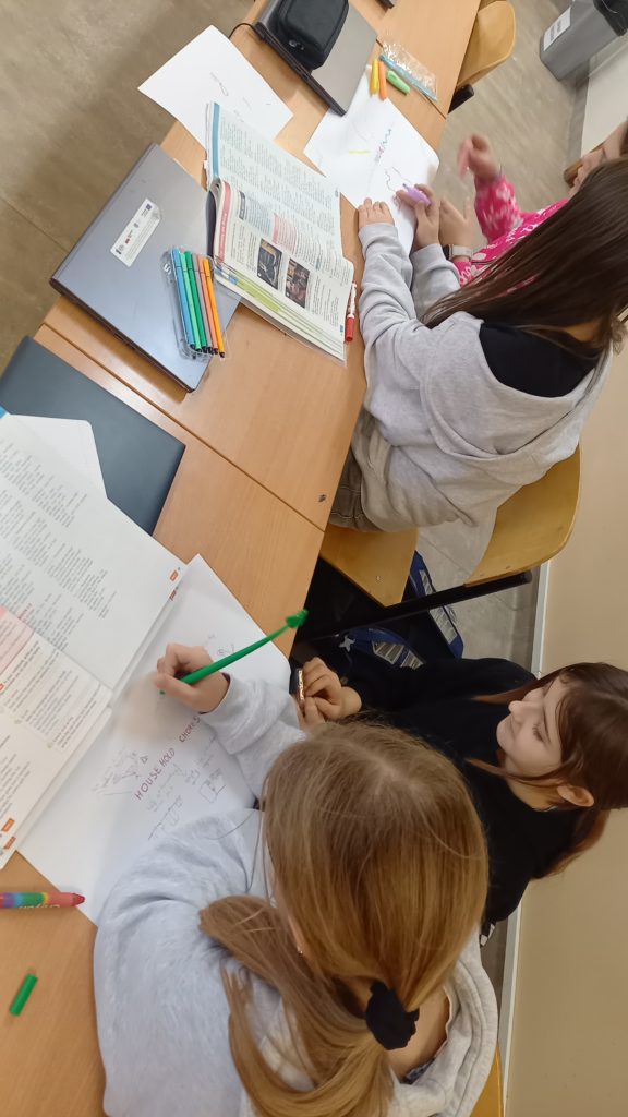 Uczniowie klasy VI szkoły podstawowej na zajęciach w wychowawcą i lekcjach angielskiego.